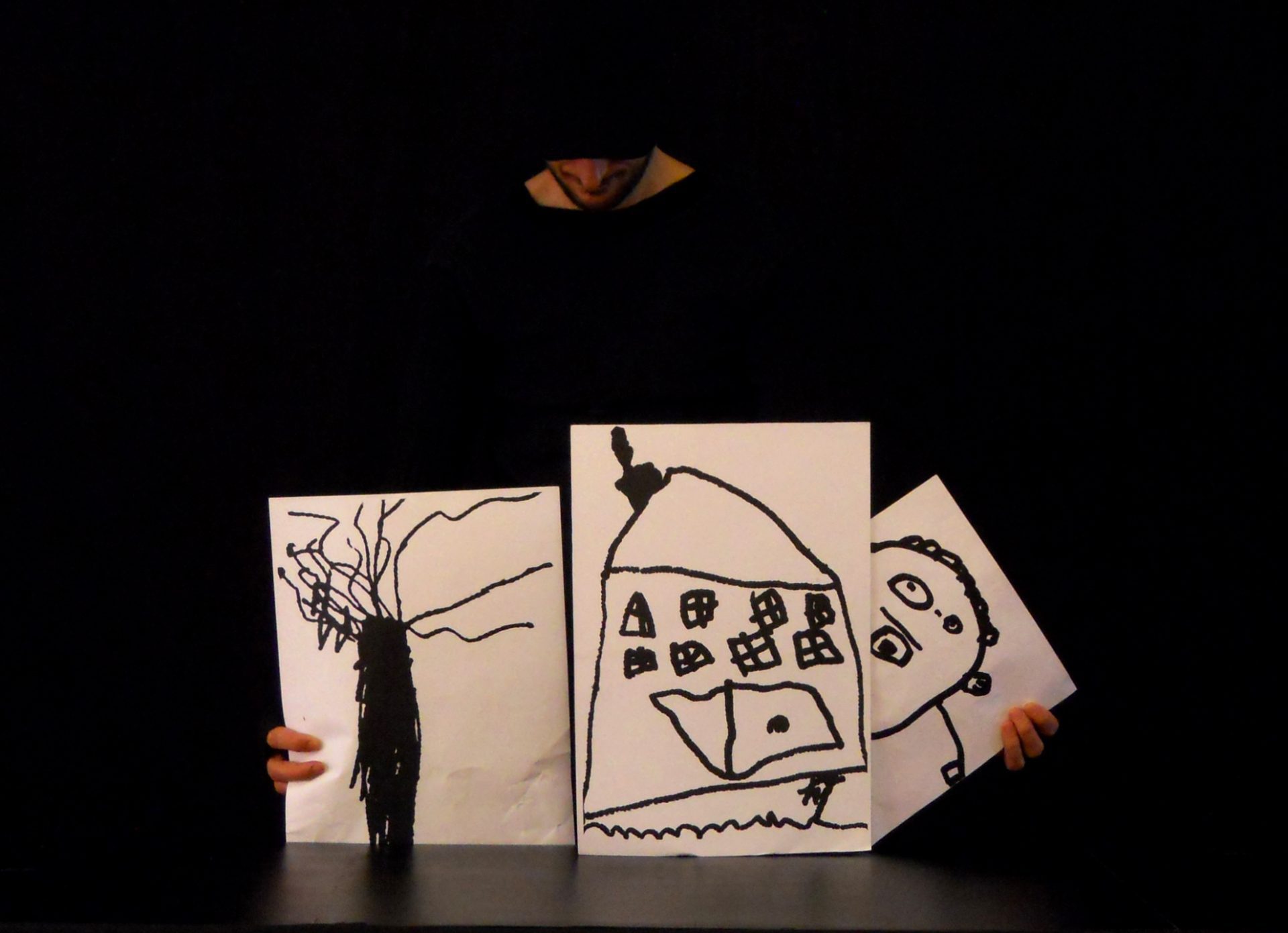 Un homme, un arbre, deux femmes, trois maisons, un balai, des nuages, du soleil et quelques créatures… Des papiers avec des dessins d’enfants, s’animent pour nous emmener dans leur monde blanc tracé de noir, abstrait mais bien réel.