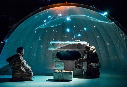 Entrez doucement dans le monde enneigé d’Élisapie, une petite fille inuite, qui vous emmènera sur son traîneau à chiens jusqu’aux pays des aurores boréales. Laissez-vous bercer par sa langue magnifique, l’inuktitut, et découvrez son univers où le gigantesque côtoie le minuscule. Un spectacle intime emmitouflé de lumières, de sons et d’émotions.