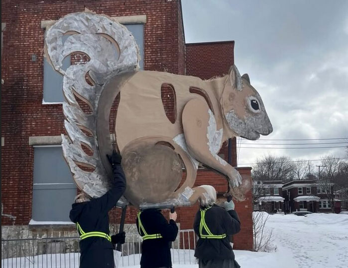 Grande marionnette crée pour la parade de la faune urbaine lors du vingtième anniversaire du festival Casteliers 2025