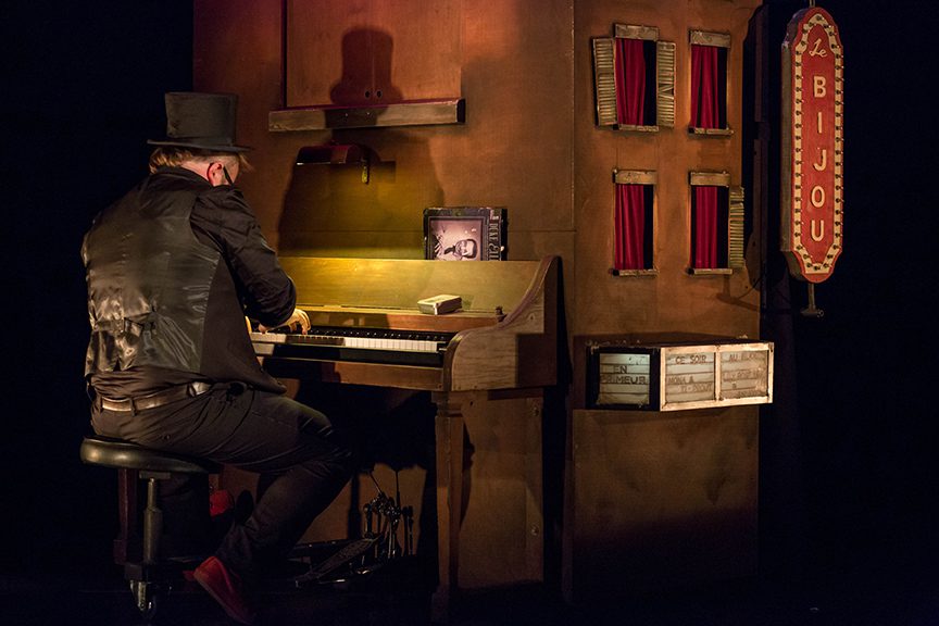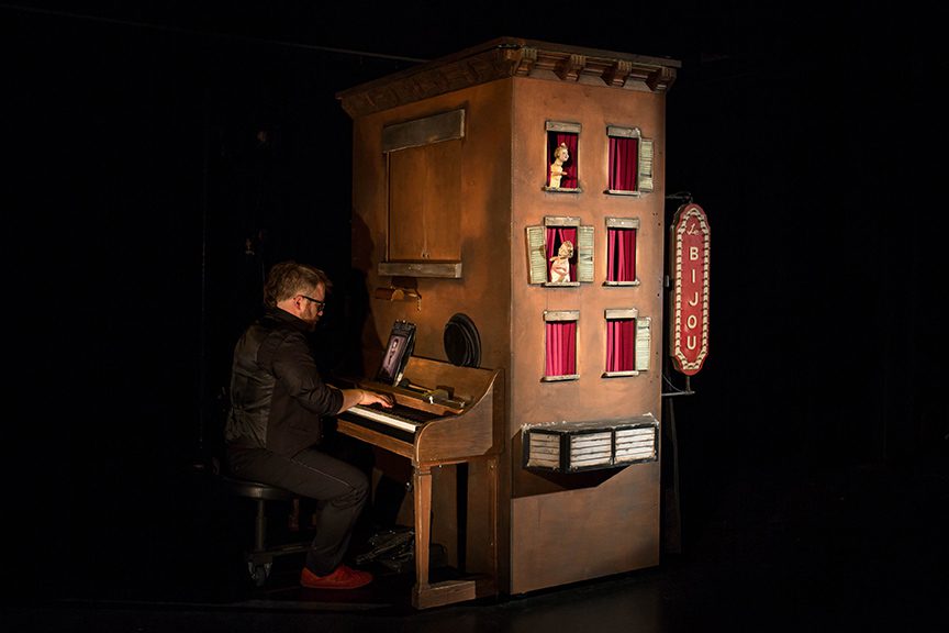 Bijoux est un spectacle de marionnettes qui prend vie au coeur d’un piano-castelet. C’est la rencontre d’une vieille dame à la mémoire morcelée et d’une petite fille qui, sur les toits, s’amuse à défier le vide. C’est la rencontre du Montréal d’aujourd’hui avec celui des cabarets des années 50. L’histoire d’une amitié sans âge entre deux petits bijoux qui, telles de mauvaises herbes, tentent de se frayer un chemin à travers les craques du bitume.