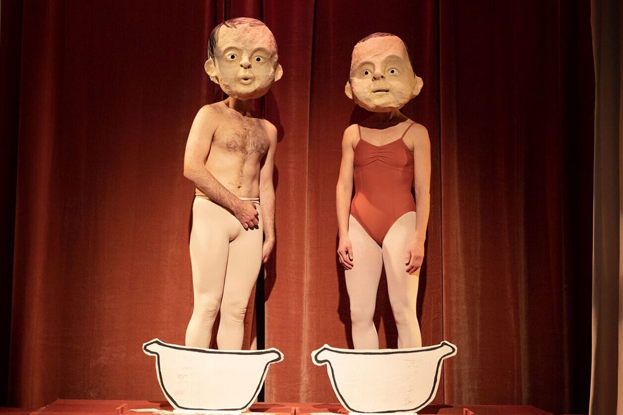 À travers ce cabaret absurde teinté d’une touche de vaudeville, la chorégraphe Kimberley de Jong et le metteur en scène Jon Lachlan Stewart signent leur première collaboration, à la croisée du théâtre physique, de la marionnette, de la danse, de la projection vidéo et de la performance en direct.