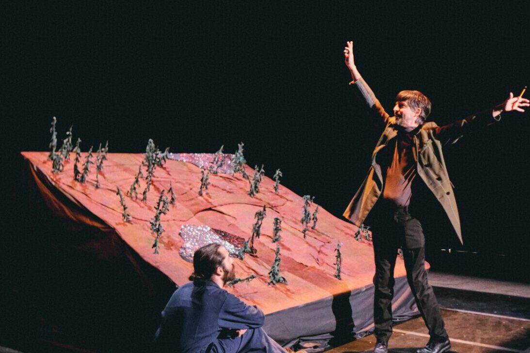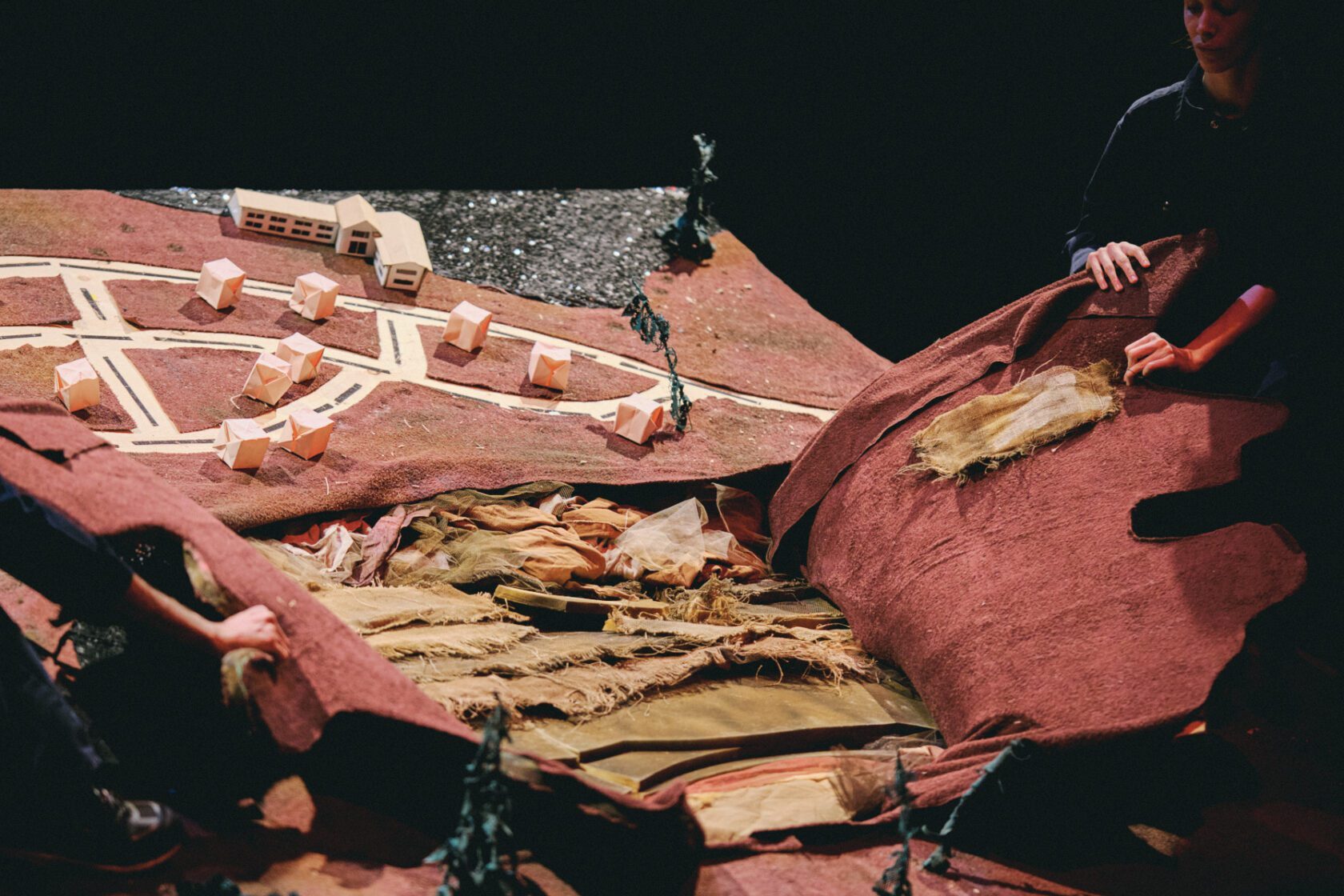 La scène, transposée en ce majestueux territoire nord-côtier, s’anime pour nous raconter l’épopée de l’exploitation du minerai de fer au Québec. Accompagné d’un narrateur joueur, et grâce à la manipulation de deux interprètes, ce territoire danse pour devenir vivant et dévoiler les multiples facettes de cette histoire. À l’ombre de cette grande épinette, on raconte comment on a souillé, sans réserve, les jupons de notre territoire.