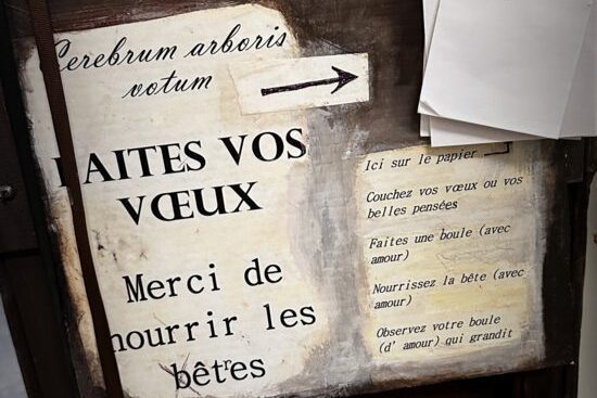 Une grande bête déambule en invitant les passants à écrire leurs vœux ou leurs mots doux sur un petit papier qu’ils doivent mettre en boule pour les faire avaler à une fleur gourmande, vers sa tendre progéniture qui grandi sous ses racines… C’est le temps de réfléchir à ses propres rêves, à ce qui les nourri, à ce qu’ils nourrissent intimement et collectivement. Comme dans leur vie quotidienne, les passants ont le choix de participer de loin, de s’approcher, d’être spectateur des émotions des autres, des leurs, d’être eux-mêmes acteurs ou d’entrer dans un petit monde intime en regardant le parcours des mots par le trou de la boîte.