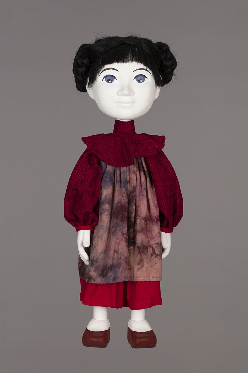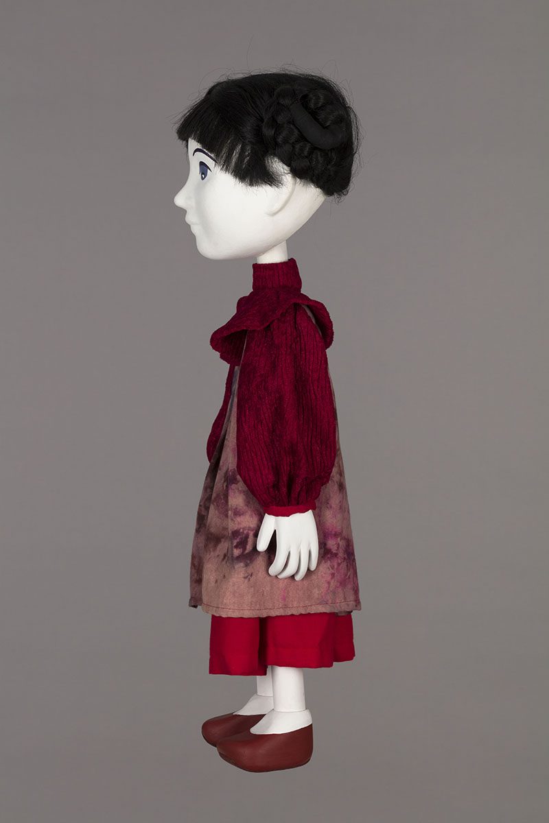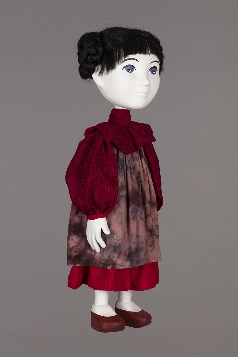Marionnette du personnage de Marie. C’est une petite fille aux cheveux noirs et aux yeux bleus. Elle est vêtue d’une robe et de chaussures rouges.