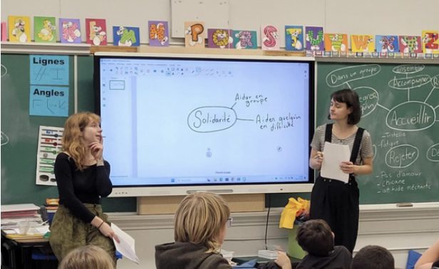 Sur la photo, les artistes Mélina Kerhoas et Évelyne Pépin sont allées rencontrer des élèves de 4e année pour discuter autour de thèmes abordés dans leur création, pour entendre leurs réflexions sur l’accueil, la différence, l’entraide et la solidarité. Les mêmes élèves assisteront à une représentation de L’arrivée des opossums le 19 novembre, qui sera suivie d’un moment d’échange avec les artistes.