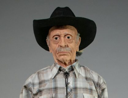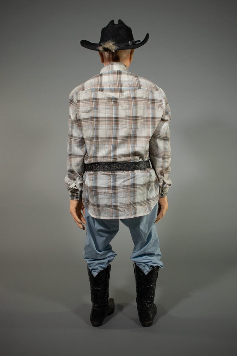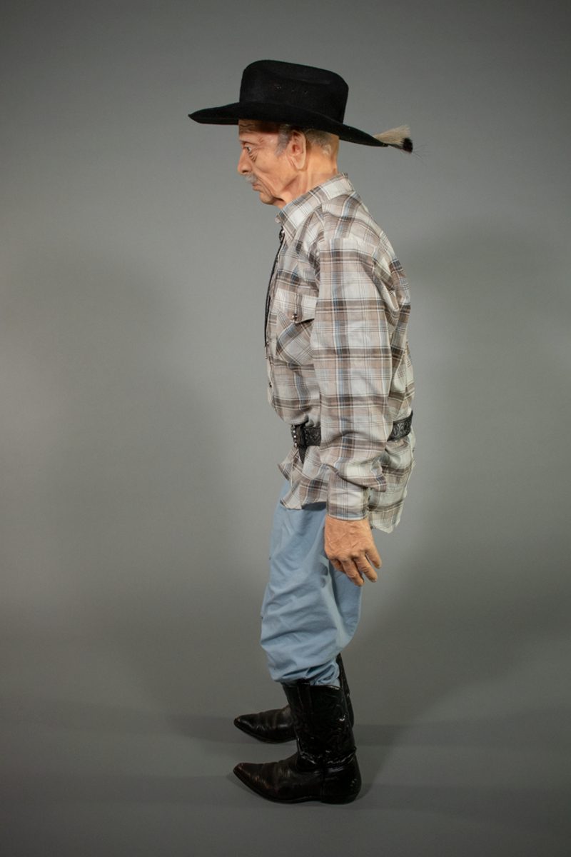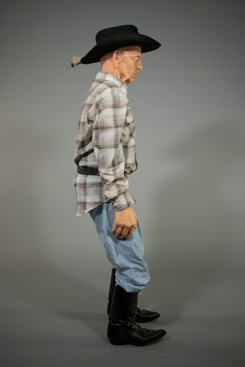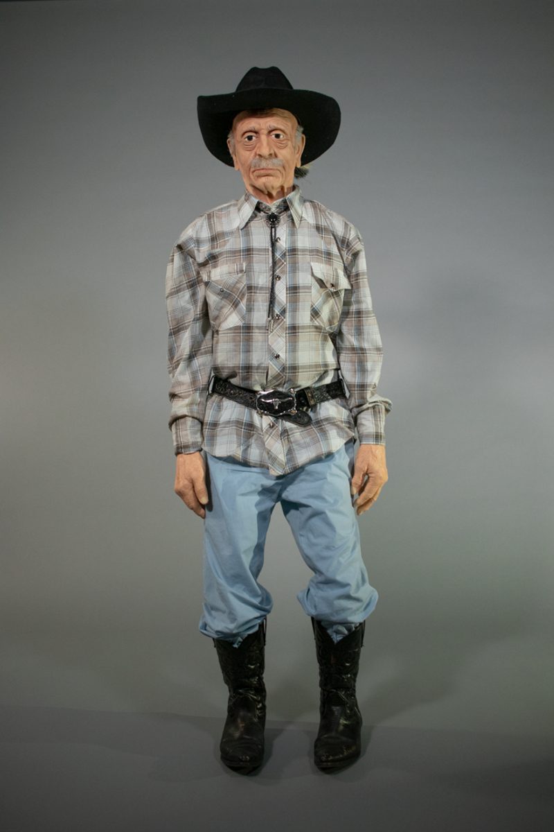 Marionnette hyperréaliste représentant un vieil homme aux cheveux blancs, portant un chapeau de cowboy, une chemise à carreaux, des jeans, une ceinture et des bottes.