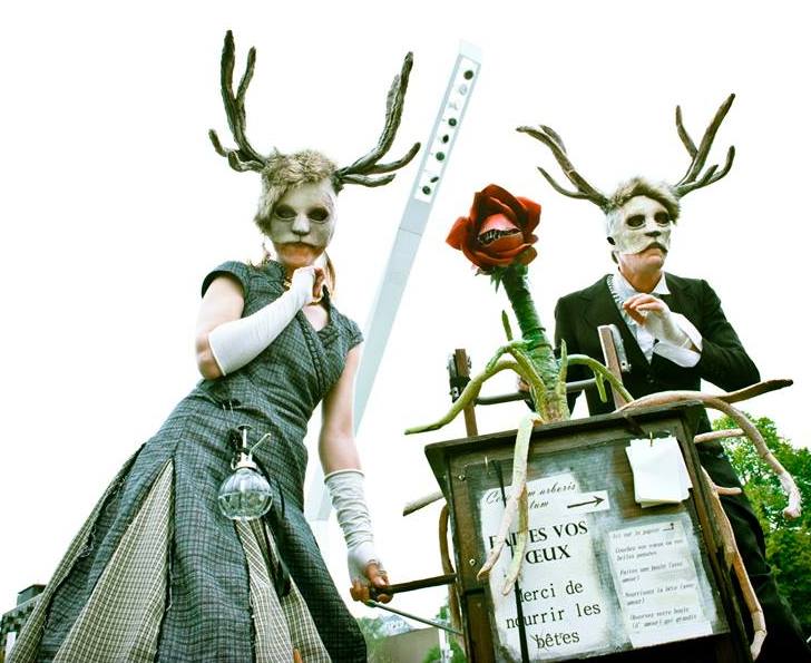 -Déambulation interactive pour deux échassiers et deux marionnettes, d’une durée de 3 x 30 ou de 2 x 45 minutes.